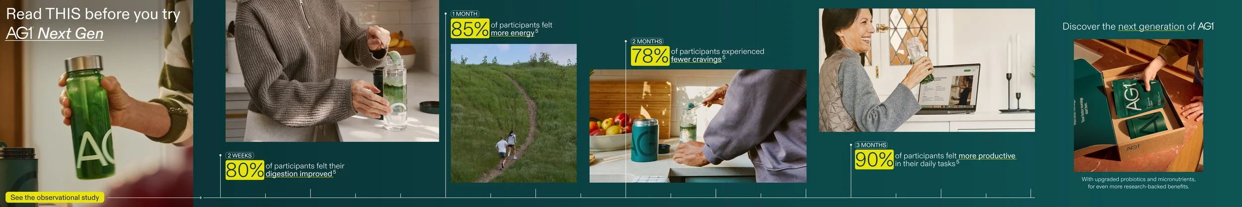 AG1 has been endorsed by influencers and health experts, name-dropped on podcasts, and praised for its results for more than a decade. As the brand prepared to launch its Next Gen formula, I helped create assets that highlighted the tangible benefits of incorporating AG1 into everyday life. Spanning Meta, Spotify, and YouTube, I developed ads designed to both educate and attract new customers while retaining AG1’s growing user base. From Instagram carousels that broke down the details to Spotify bumpers aimed at listeners staying on track with their New Year’s resolutions, each asset was built to perform seamlessly across platforms.