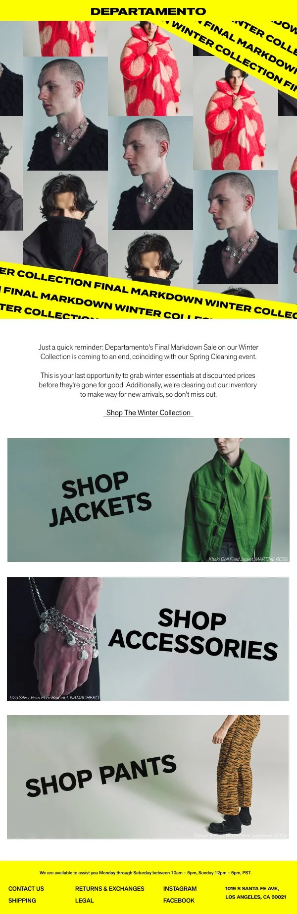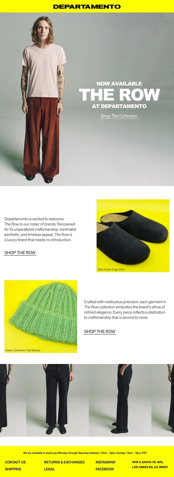 Departamento is a boutique fashion showroom located in Downtown Los Angeles. The store’s design is utilitarian and features raw materials and a maze of mirrors that confuse visitors in the best way, it is a high-brow funhouse filled with cutting-edge men’s fashion. Two email and social campaigns created centered around a winter markdown sale and the introduction of The Row to the store. Each campaign embraced the store’s iconic emergency yellow color and the Akzidenz Grotesk font choice utilized in their logo.