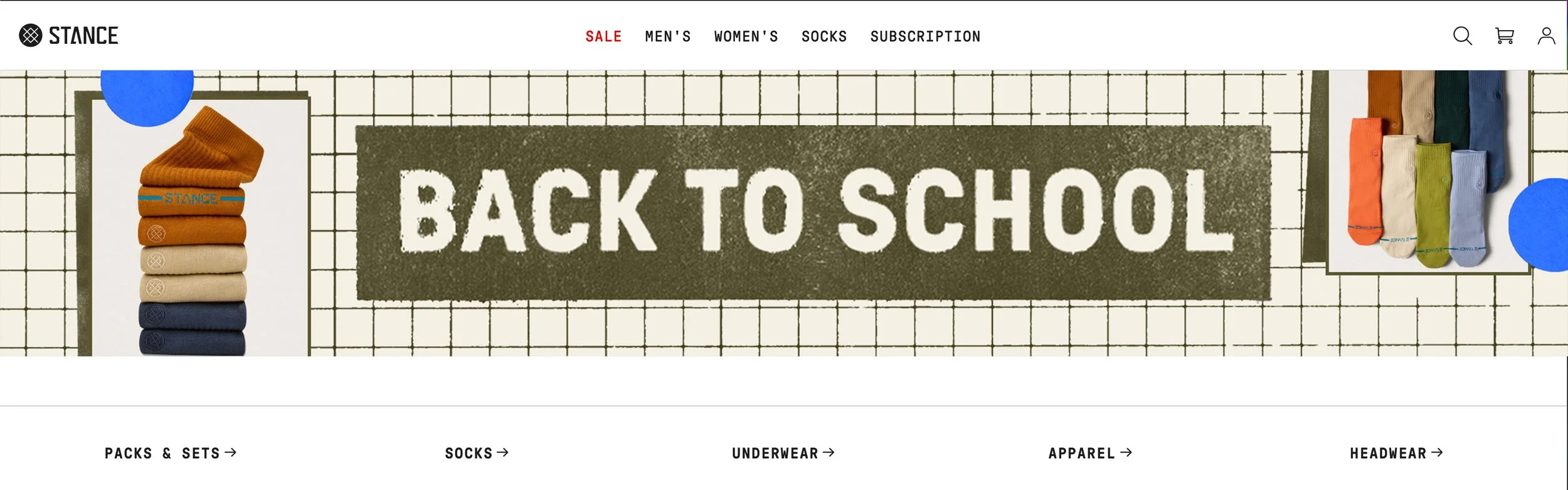 For Stance’s Back to School campaign, the goal was to stay true to the brand’s gritty edge while introducing an academic sensibility that nodded to the research-backed nature of its socks and apparel. Using graph paper, textured elements, and strategic pops of color, the creative direction allowed the product’s autumnal palette to take center stage. Rolled out across web, paid media, and email, the campaign created cohesive storytelling between brand identity and the back-to-school moment - giving an everyday wardrobe staple the recognition it deserves.
